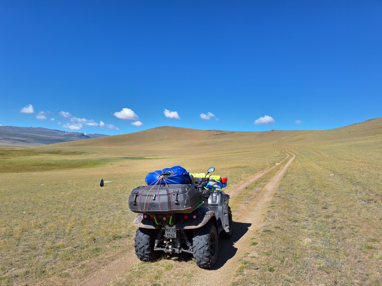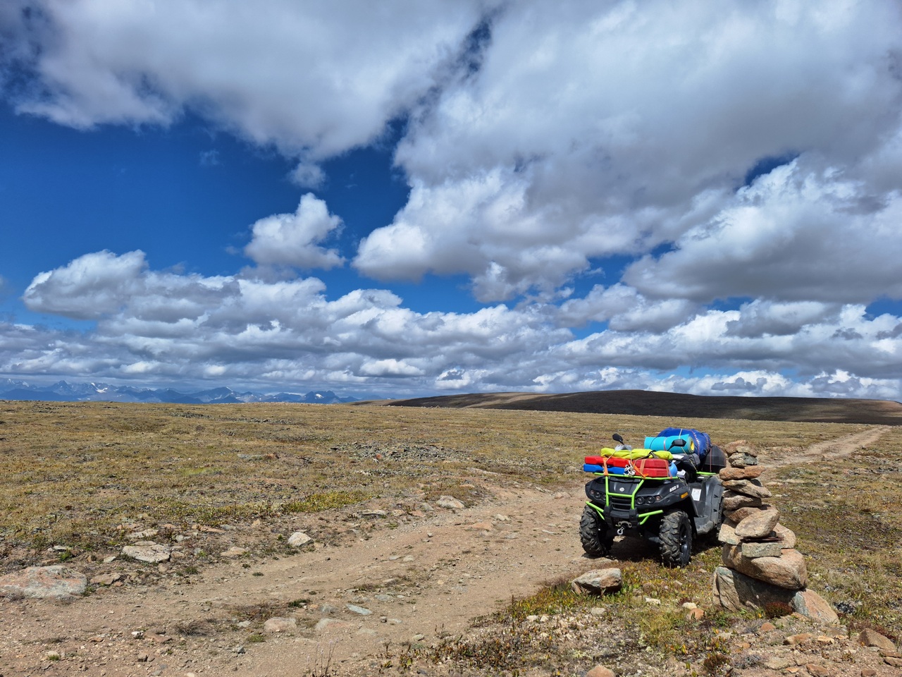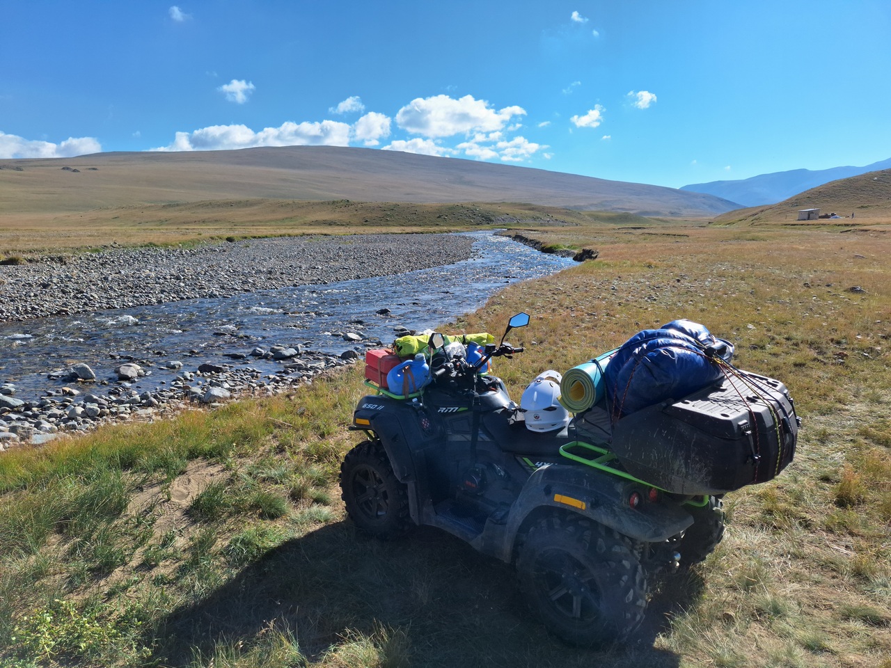 Старт — из Кош-Агача, районного центра на юге Алтая. Сюда я добрался на машине, а квадроцикл вез в прицепе, чтобы начать настоящее приключение уже в степи. Чуйская степь встречает бескрайними просторами: дорога здесь ровная, и гружёный квадроцикл уверенно держит 80–85 км/ч. Но это только разминка. Первый день всегда немного тревожный: впереди неизвестность, и невольно ловишь себя на мысли о том, как поведёт себя техника. Ведь путь лежит на Укок — местные называют его краем жизни или границей с небесным миром. Это сакральное плато, где сходятся границы четырёх государств: России, Китая, Монголии и Казахстана.