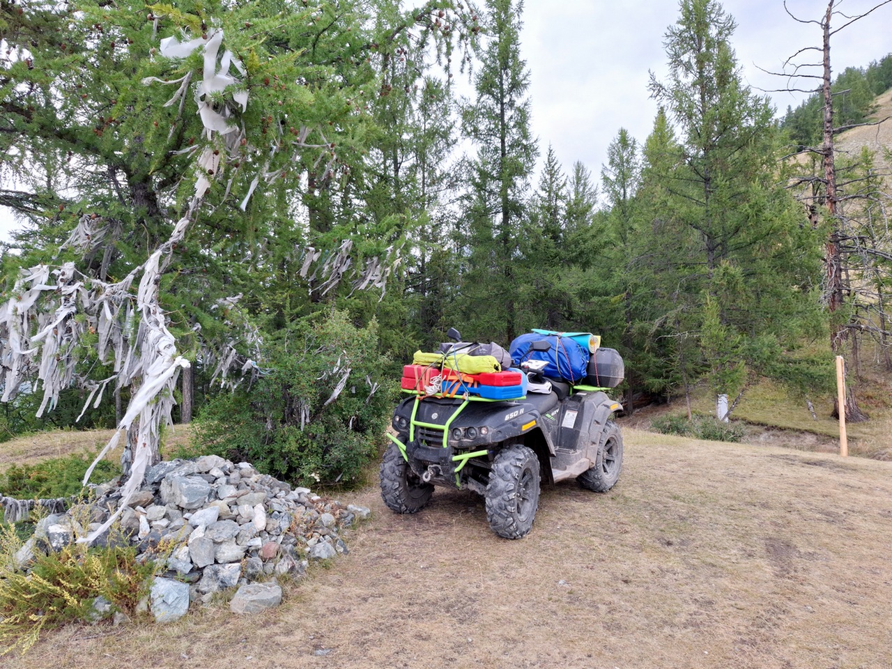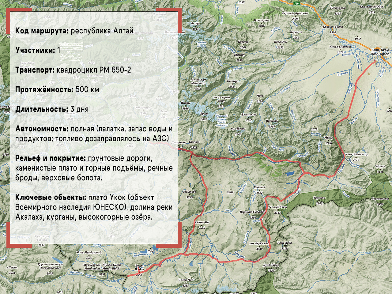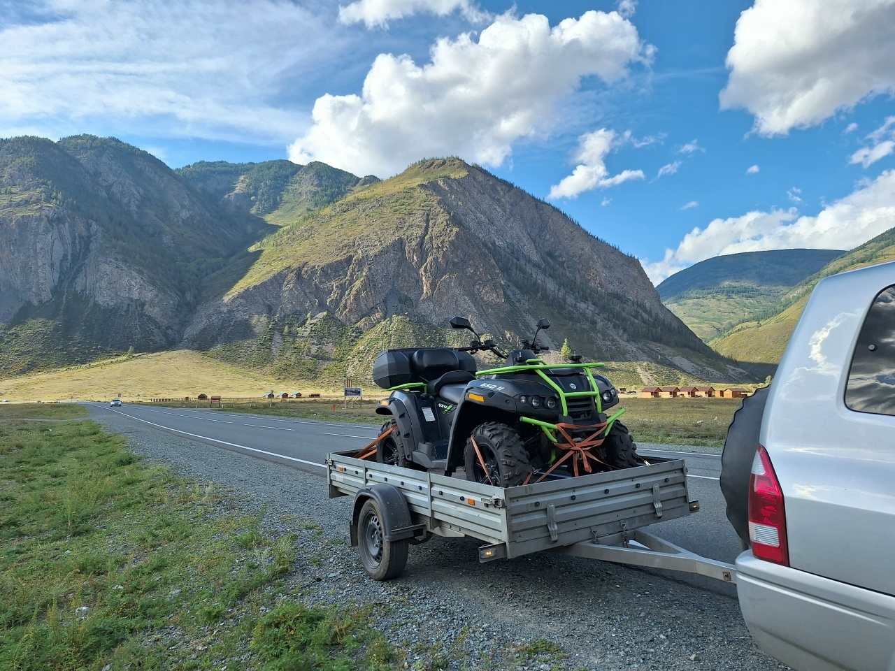 Старт — из Кош-Агача, районного центра на юге Алтая. Сюда я добрался на машине, а квадроцикл вез в прицепе, чтобы начать настоящее приключение уже в степи. Чуйская степь встречает бескрайними просторами: дорога здесь ровная, и гружёный квадроцикл уверенно держит 80–85 км/ч. Но это только разминка. Первый день всегда немного тревожный: впереди неизвестность, и невольно ловишь себя на мысли о том, как поведёт себя техника. Ведь путь лежит на Укок — местные называют его краем жизни или границей с небесным миром. Это сакральное плато, где сходятся границы четырёх государств: России, Китая, Монголии и Казахстана.