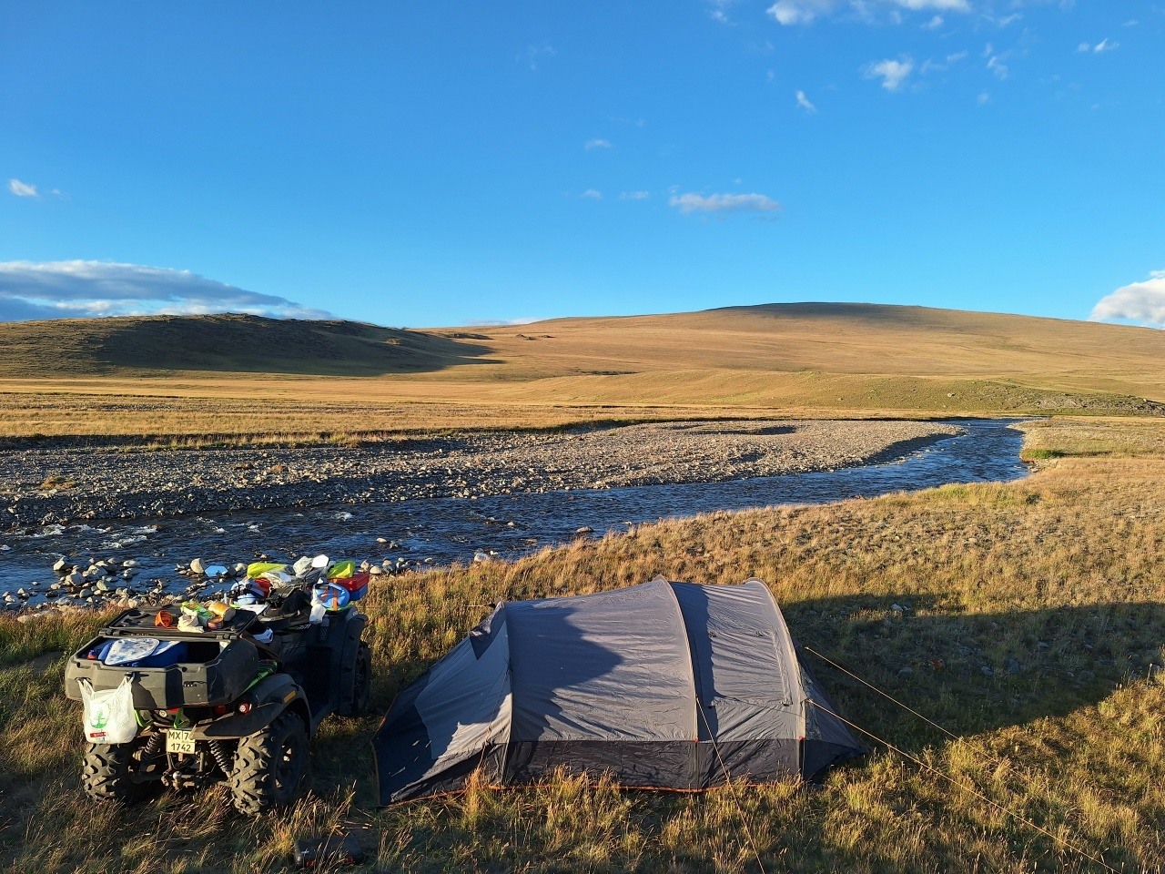 И вот он — Укок. Плато, окружённое горами, почти без растительности, с ветром, который не знает преград. Климат здесь суров, как на севере. На ночёвку останавливаюсь у реки Колгуты: палатку привязываю к квадроциклу — иначе унесёт ветром. Ночью мороз до –6°C, вода в канистрах превращается в лёд. Укрываюсь с головой в спальник, чтобы хоть как-то согреться и скорее заснуть.
